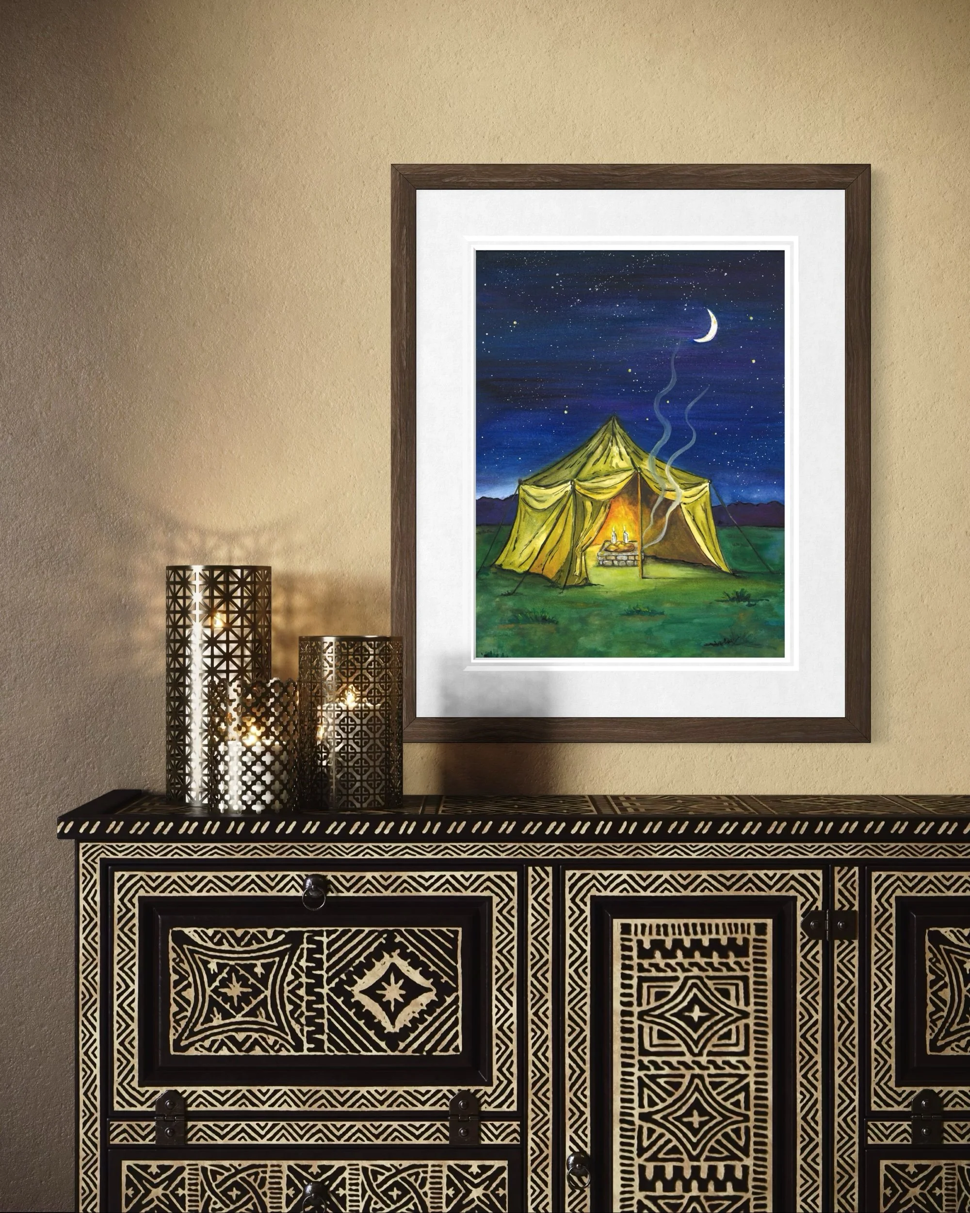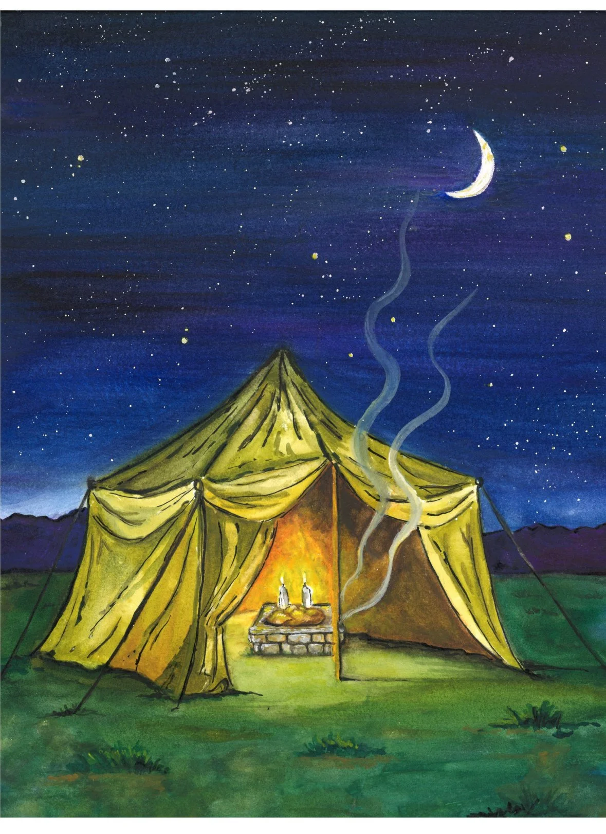 This watercolor painting depicts Abraham and Sarah’s tent, glowing gently beneath a star-filled night sky. The warm golden tones radiating from the open tent reflect the timeless spirit of hospitality; a home always open, a table always ready, and a welcome extended to every traveler.
